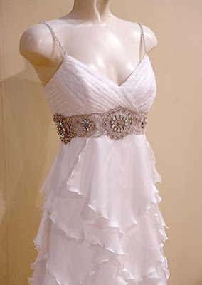 The intricate work below and at right is a metallic lace strip with jeweled brooches added giving this gown a rich, two-tone texture.